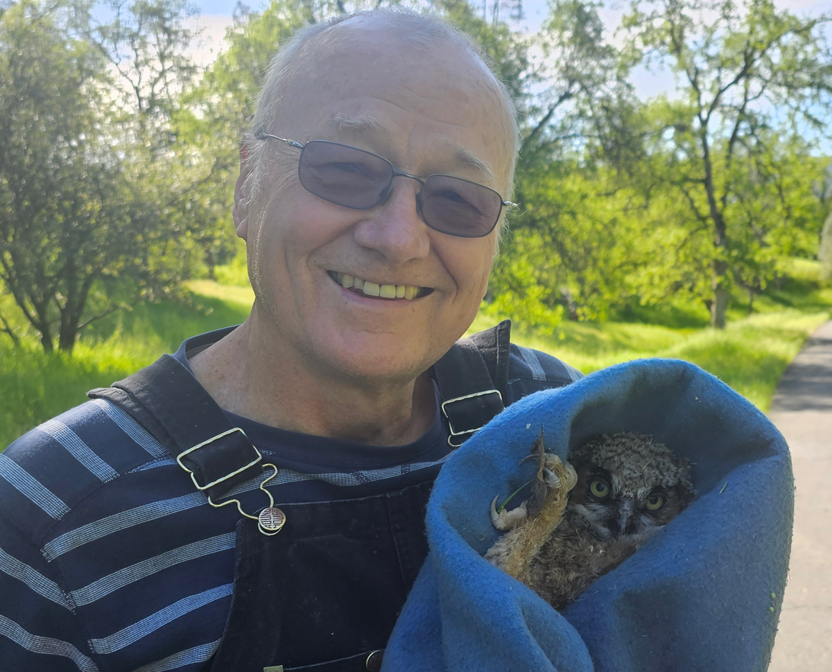 One of the high points of living with wildlife started on a walk with the dogs. Jessie was clearly interested in something on the hillside. We couldn't see anything right off, but upon closer inspection there was a young owl in the grasses. We left it be and decided that if it was still there when we returned, we'd take a step. In summary, Michael wrapped Sam in a blanket, took him to Shasta Wildlife Rescue who cared for him until he was mature enough to release back out to the canyon behind our home. Now when we hear the owls we think that maybe Sam has a family of his own.