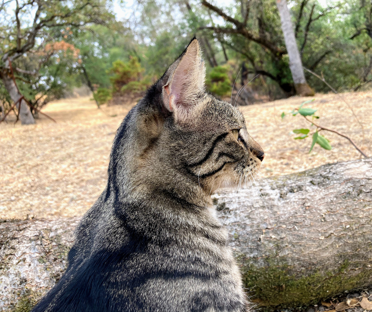 Later in August of 2021, we saw a cat fleeting across one of the fields. He saw us and we all stopped and made eye contact. Turned out to be a young feral cat. After a month of coaxing with food, we were able to get him into a carrier and over to the local vet. Once neutered and vaccinated, he came home to join Rey in her garage apartment. They took it slowly, but after sharing a few catches (mouse/mole/vole/gopher) Rey relaxed. Their bond has grown over the years, and Jules is vigilent to keep Rey safe. If she hasn't come in yet at night, he will keep watch until she does.