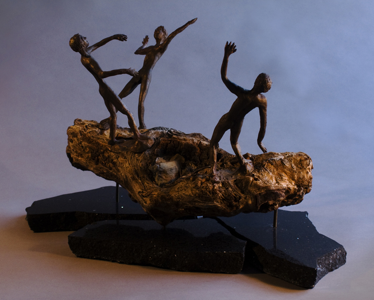 Bronze sails float on marble waves. This piece was originally built as an idea for a "water element" in friends' yard. They couldn't pay for it. I changed it up, kept the piece, and almost put it in a pond. It now lives on an Oak high stump.