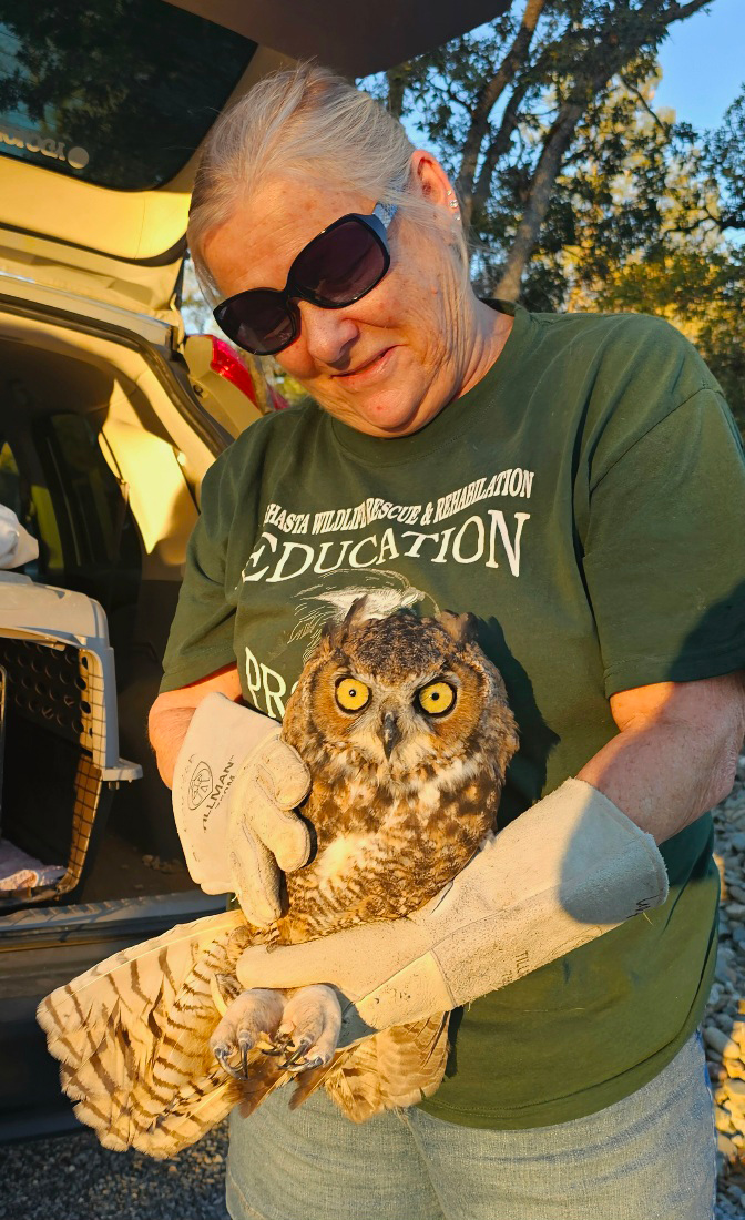 One of the high points of living with wildlife started on a walk with the dogs. Jessie was clearly interested in something on the hillside. We couldn't see anything right off, but upon closer inspection there was a young owl in the grasses. We left it be and decided that if it was still there when we returned, we'd take a step. In summary, Michael wrapped Sam in a blanket, took him to Shasta Wildlife Rescue who cared for him until he was mature enough to release back out to the canyon behind our home. Now when we hear the owls we think that maybe Sam has a family of his own.