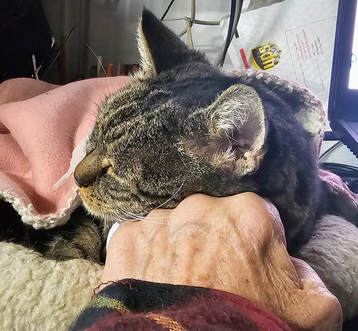 April 2021, a little over four months in to living in our new space, we got a call from a neighbor asking us if our cat was missing. We checked and everyone was indoors. The following day a friendly tabby was wandering around our place. Michael sat down in the back and this cat climbed onto his lap. After checking for a chip at the vet, and no responses from posted signs and online notices, we named her Rey. The force was strong in her.